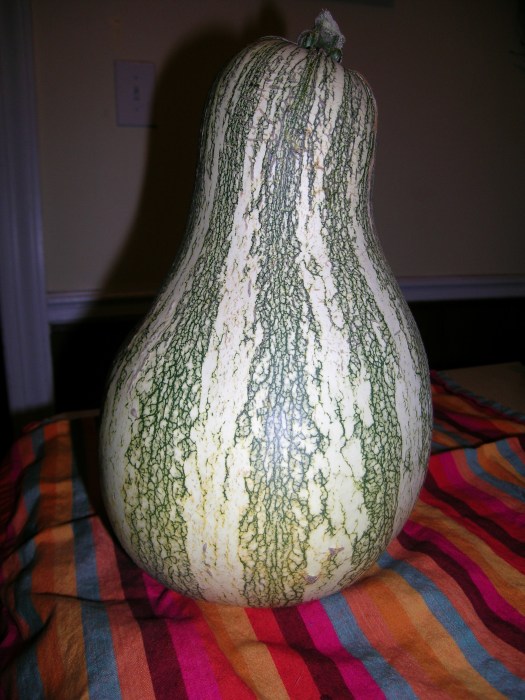 Although it sounds exotic, the sweet potato pumpkin (Cucurbita moschata) was the late fall glory of the African Virginian’s table and as our ancestors were sold South they carried its seeds with them. Thomas Jefferson stated clearly that it was “On account of the extreme resemblance of its taste to that of the sweet potato, it may be originating form your islands…it is well esteemed at our tables, and particularly valued by our Negroes.” A few years later, George Washington would echo Jefferson’s letter to Samuel Vaughn, writing Anthony Young in England in 1792—“We have lately had introduced a plant of the melon species which…we have called a pumpkin…its taste ..is that of the sweet potato…It is but yet little known…but it is particularly valued by our Negroes..” Cushaws produced from the late summer into the late fall, taking the place of sweet potatoes while they were out of season. The word cushaw is derived from an Algonquin word, although the plant itself ultimately derives from the indigenous peoples of Central America and the West Indies, possibly Jamaica. In Jamaica they replaced the edible gourds that West and Central Africans were used to. When African Virginians moved across the Piedmont into the Appalachians, they brought the sweet potato pumpkin with them, and like the banjo (Kimbundu: mbanza) it became part of Southern Appalachian culture. Cushaws are made into cushaw butter, pie filling, puddings, and are cooked on their own. Striped green and creamy white, the “potato pumpkin,” made it into The Virginia Housewife, having attained popularity across lines of class and race.