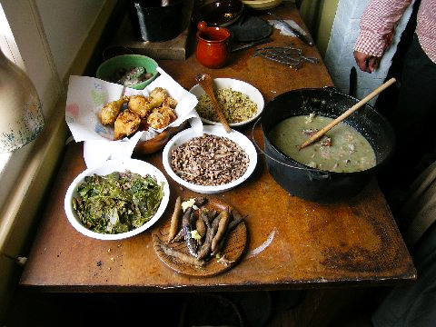 Food tells you a lot about how we got to be how we are….In 1750 we were anywhere from 1-3 generations removed from Africa…if that…….We were not largely Afro-Christian and there were various dialects of Black English and Black French–read Gullah/Geechee, Patois, Creole, etc.  In 1850 we were largely 4-5 generations removed from Africa (especially in the Upper South) while in the Lower South this number was lower owing to the late slave trade.  We were largely Afro-Christian LEANING (varieties of Baptist and Methodist) with elements of folk religion and we spoke a generalized Plantation Creole English based largely on those dialects from Maryland, Virginia and upper North Carolina with inflections and loan words in the Deep South from Gullah/Geechee and Afro-Creole dialects of French in Louisiana, Mississippi and Alabama.  Our music was the “Virginia music” based on gourd banjos, rattles, the bones, the fiddle, triangle and clandestine drums made from gourds, barrels, and boxes, flutes, quills and mouthbows.