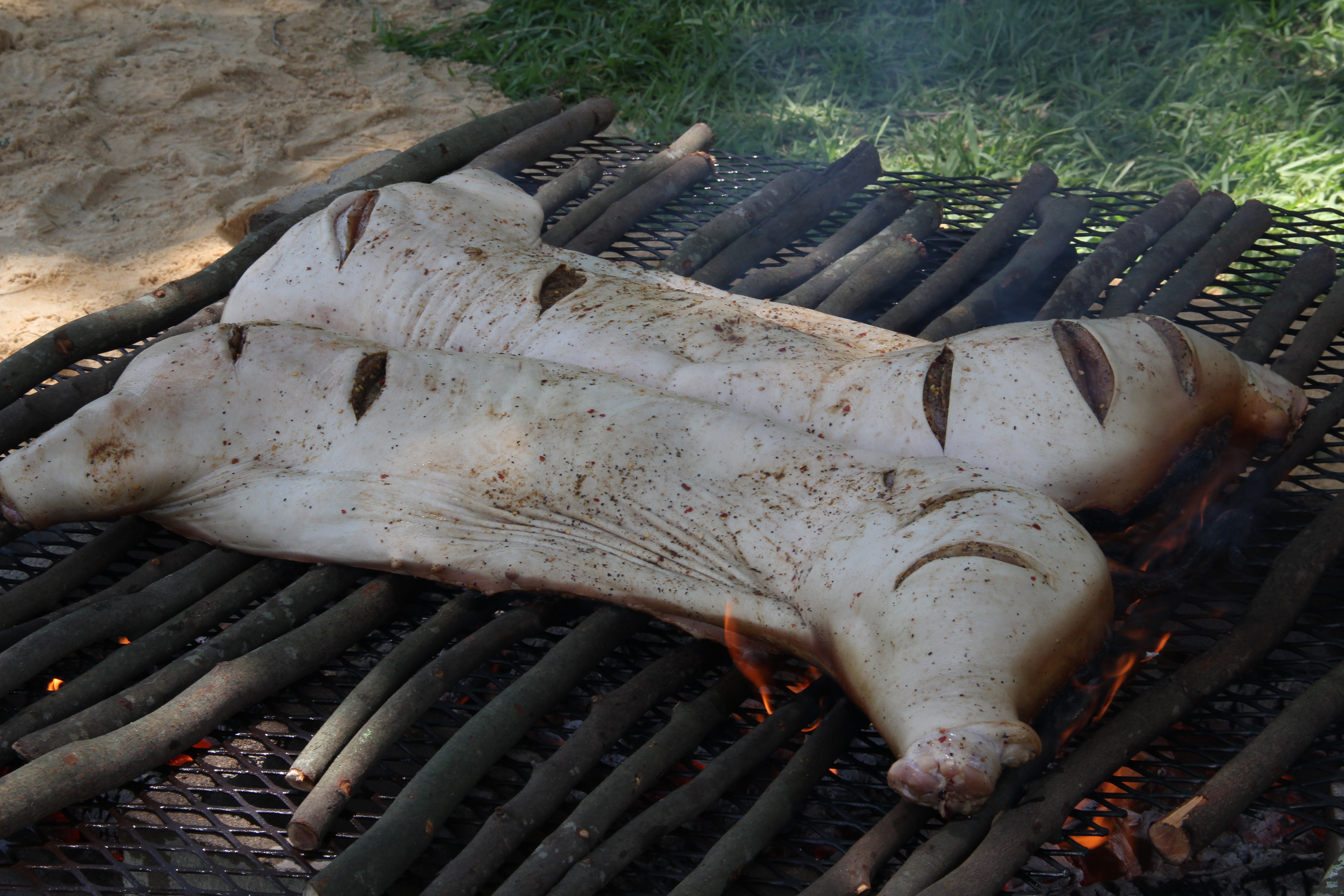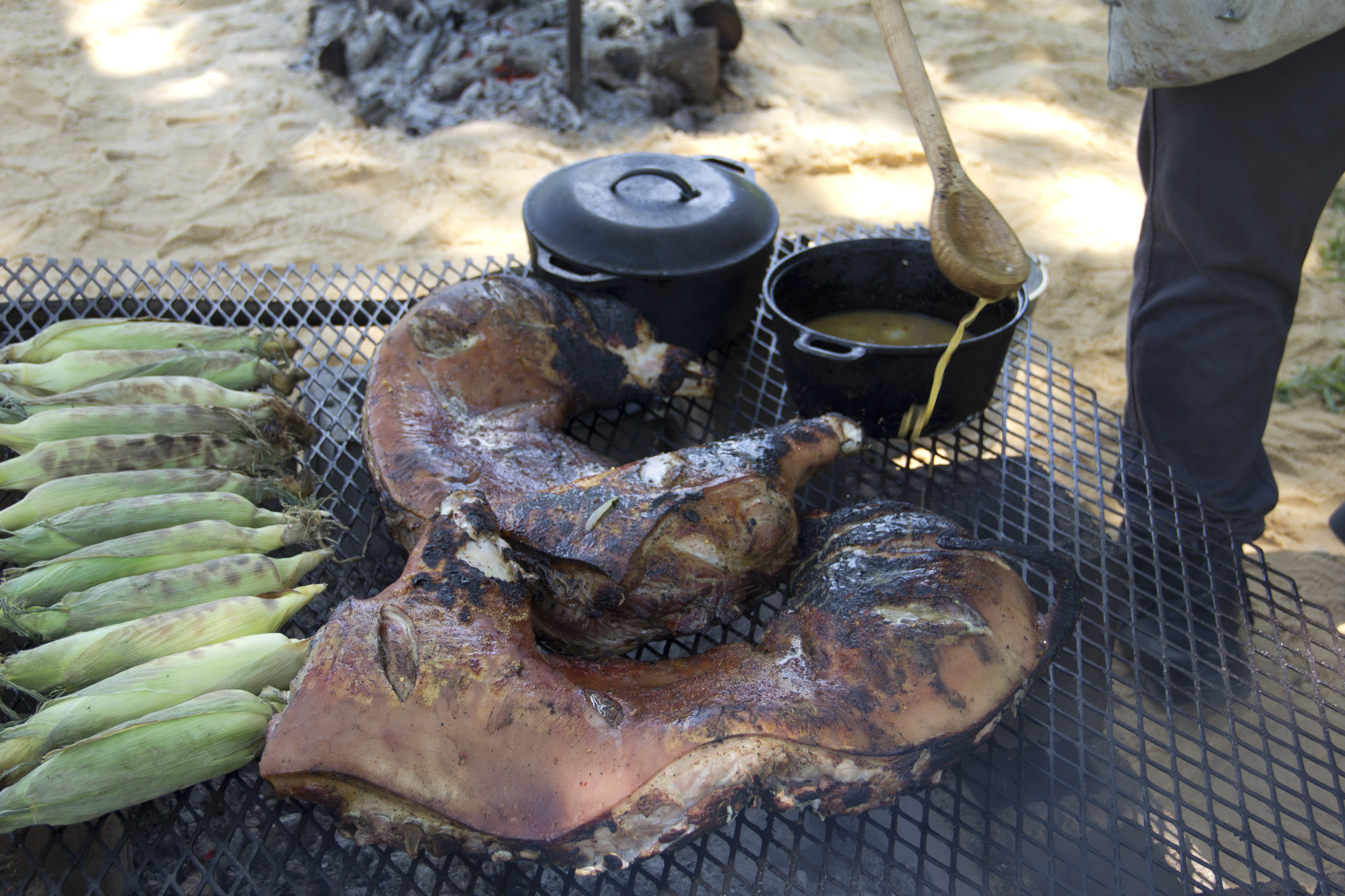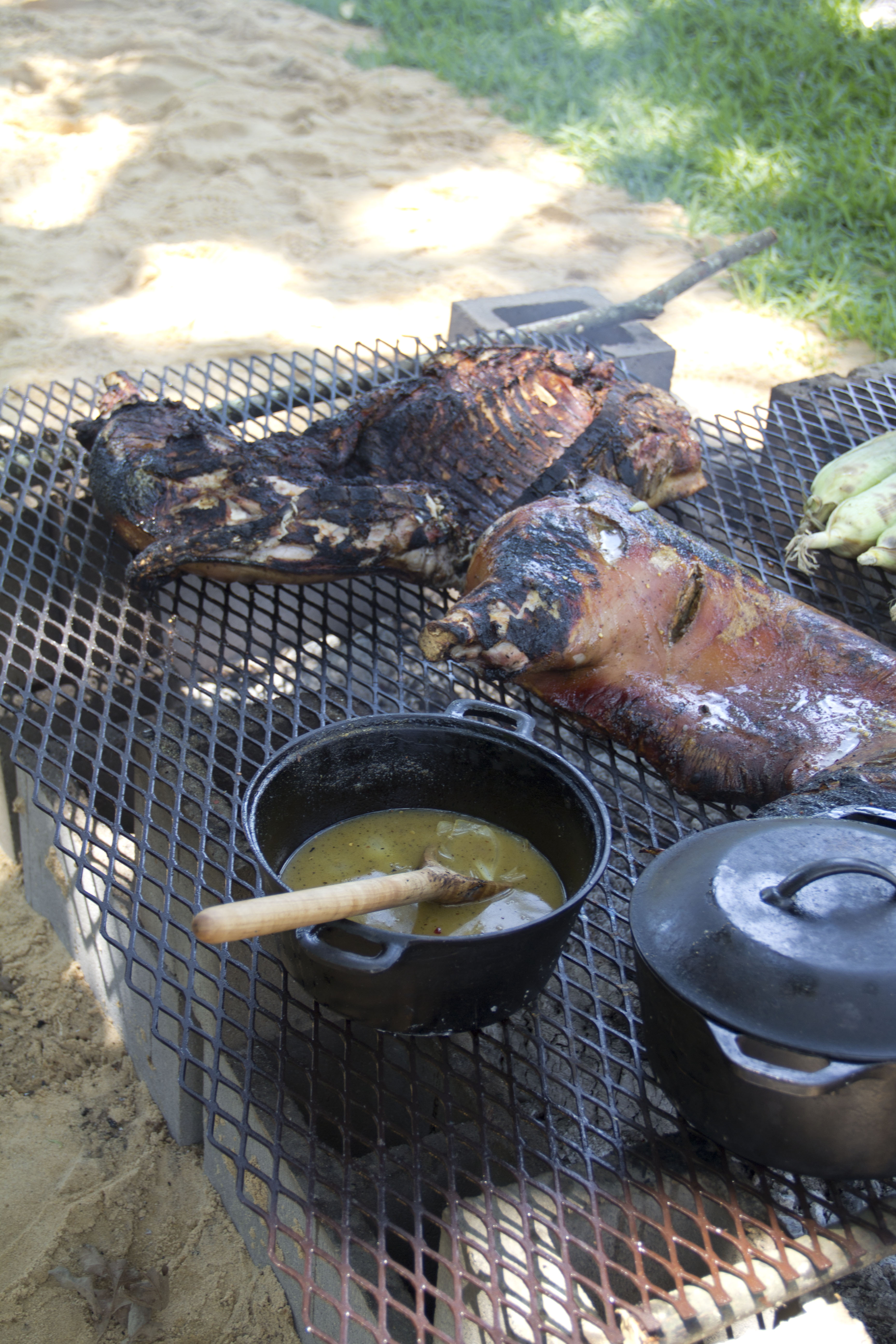 The method of cooking the meat was to dig a trench in the ground about six feet long and eighteen inches deep. This trench was filled with wood and bark which was set on fire, and, when it was burned to a great bed of coals, the hog was split through the back bone, and laid on poles which had been placed across the trench. The sheep were treated in the same way, and both were turned from side to side as they cooked. During the process of roasting the cooks basted the carcasses with a preparation furnished from the great house, consisting of butter